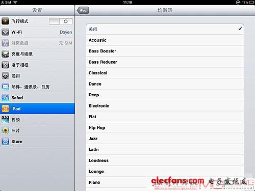 3. 輕敲左邊欄的“iPod”選項(xiàng),即可看到右邊屏幕出現(xiàn)均衡器設(shè)置選項(xiàng)(圖12)。