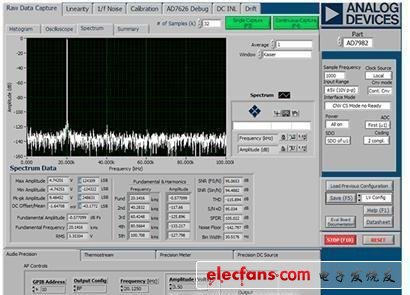 8 ,后者是一款PulSAR系列低功耗ADC(2.5 V、100 kSPS時(shí)為1.35 mW)。該ADC由超低失真、超低噪聲放大器AD8597直接驅(qū)動(dòng),其基準(zhǔn)電壓源是超低噪聲5 V ADR435。采用1 kHz
