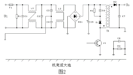 對(duì)共模干擾信號(hào)i4 要進(jìn)行完全抑制,一般很困難,特別是沒有金屬機(jī)殼屏蔽的情況下,因?yàn)樵诟袘?yīng)產(chǎn)生共模干擾信號(hào)的回路中,其中的一個(gè)“元器件”是線路板與大地之間的等效電容,此“元器件”的數(shù)值一般是不穩(wěn)定的,進(jìn)行設(shè)計(jì)時(shí)對(duì)指標(biāo)要留有足夠的余量。圖2 中L2 和C3、C4是共模干擾信號(hào)抑制電路器件,在輸入功率較大的電路中,L2 一般要用兩個(gè),甚至三個(gè),其中一個(gè)多為環(huán)形磁心電感。