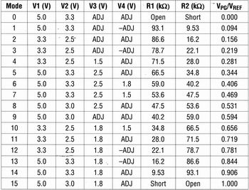 即使在系統(tǒng)電壓沒有最后確定的情況下,使用者仍然可以很自由的選擇LTC2900、LTC2901、LTC2902來實現(xiàn)多電壓監(jiān)視。如圖2所示,使用者只需在VREF和GND之間連接一個電阻分壓器,并把分流點連接到管腳VPG就可獲得所需的電壓組合。可編程過程出現(xiàn)在上電期間,并且該過程對使用者透明。表2列出了編程實現(xiàn)不同電壓組合時推薦用1%的電阻阻值,表中的最后一列是當(dāng)使用標(biāo)準(zhǔn)DAC編程時的優(yōu)化VPG/VREF比(±0.01)。