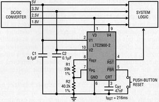 微處理器是需要可靠POR信號的典型例子。在所有電源電壓到達安全門限前(不考慮系統(tǒng)是否上電),LTC2900、LTC2901、LTC2902可以避免處理器執(zhí)行錯誤的指令。而且如果任何電壓超過門限范圍足夠長的持續(xù)時間且幅度較大,那么復(fù)位信號將不斷的重新發(fā)送。只有電壓返回到門限電壓以上而且持續(xù)一定的時間,復(fù)位信號線才會得到釋放。