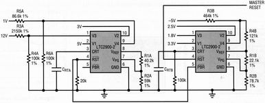 LTC2900上的管腳可以實現(xiàn)手動復(fù)位或者按鈕復(fù)位,從而保證系統(tǒng)實現(xiàn)強迫復(fù)位,通常是在和地之間接入一個按鈕開關(guān)。內(nèi)部10mA地電流源可把管腳拉到VCC。復(fù)位電路電容CRT的延時使開關(guān)自動復(fù)位。若所監(jiān)視的四個電壓輸入都在門限電壓以上,管腳上的邏輯低會把也拉低,當(dāng)返回高時,在復(fù)位時間周期過后也恢復(fù)高。管腳也可被邏輯信號驅(qū)動,其輸入最大門限是1.6V,使得該管腳可被低電壓邏輯驅(qū)動。圖7是使用兩片監(jiān)視器件LTC2900-2實現(xiàn)級聯(lián)從而監(jiān)視8電源的原理圖。其中,第一個監(jiān)視器件的復(fù)位輸出連接到第二個器件的輸入,從而保證當(dāng)?shù)谝粋€監(jiān)視器件的輸入電壓降到門限以下后,主復(fù)位保持低。當(dāng)8個電壓都在門限電壓以上時,第二個復(fù)位延時過后,主復(fù)位才釋放。
