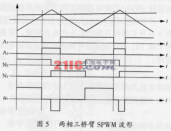 采用SPWM控制時,由N1及N2構(gòu)成的公共橋臂要同時接入電機的兩相繞組中,所以在調(diào)制時,公共橋臂的調(diào)制波就不同于A及B橋臂的調(diào)制波。