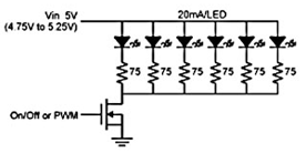 4 白光LED可以采用串聯(lián)或并聯(lián)連接方式,這兩種解決方案各有優(yōu)缺點(diǎn)。并聯(lián)方式的缺點(diǎn)是LED電流及亮度不能自動匹配。串聯(lián)方式保持固有的匹配特性,但需要更高的供電電壓。因白光LED的正向壓降為3~4V