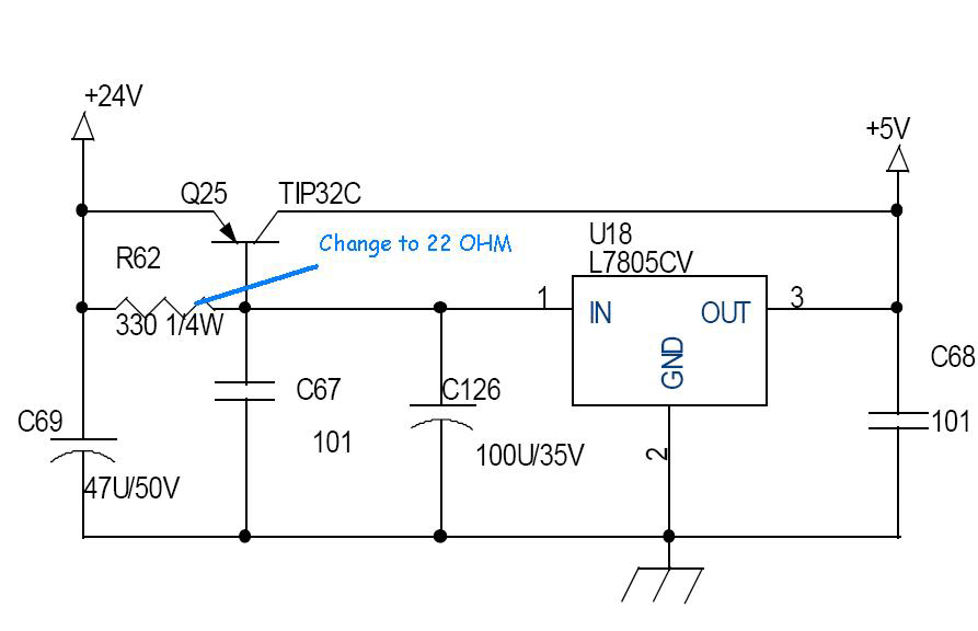 圖為在非常流行的經(jīng)典電路上做小許改動(dòng)的電路圖. 電路目的: 1)+24V 轉(zhuǎn)換為+5V +/-5%2)可提供+2A以上的電流.主要元件: TIP32C (ST)L7805CV (ST)圖中的R62,在實(shí)際應(yīng)用中已經(jīng)更改為22 OHM.功率元件TIP32C已經(jīng)加散熱片
