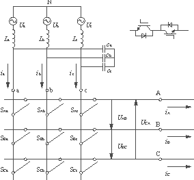 變換器(Matrix Converter)作為一種新型的交-交變頻電源,其電路拓?fù)湫问奖惶岢?,但直?979年意大利學(xué)者M(jìn).Venturini和A.Alesina提出了矩陣式變換器存在理論及控制策略后,其特點(diǎn)才為人們所關(guān)注和研究。普遍使用的是半控功率器件晶閘管。