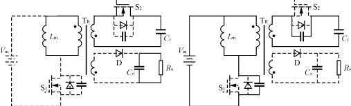 ??? 1)階段1〔t0,t1〕??? 該階段S1導(dǎo)通,Lm承受輸入電壓,激磁電流iLm正向線性增加,從負值變?yōu)檎?。?I>t1時刻S1關(guān)斷,iLm達到最大值,該階段結(jié)束。