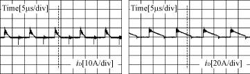 ??? 圖4分別給出了輕載(1A)及滿載(5A)時的實驗波形,從圖4(g)~圖4(j)可以看到開關(guān)管S1及S2在輕載和滿載時都實現(xiàn)了軟開關(guān)。
