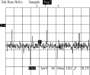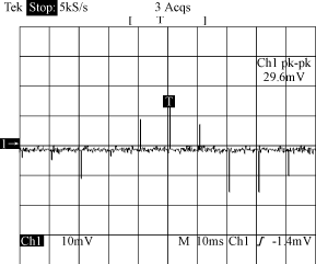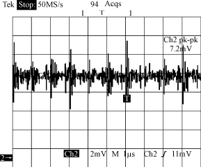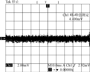 圖4??? 直流斬波式方波交流電源驅(qū)動時(shí)放大器的輸出信號展開示波圖 2.2.3??? 空間的電磁場輻射耦合檢測 ??? 在探測元件無輸入信號時(shí),測量空間的電磁場輻射耦合到放大器的輸出信號。圖5為放大器的輸出信號示波圖。