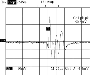 圖3??? 直流斬波式方波交流電源驅(qū)動時(shí)放大器的輸出信號示波圖
