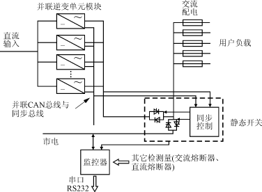 圖1? 兩個逆變單元并聯(lián)給負載供電的網(wǎng)絡模型 1.2? 逆變電源并機的數(shù)字控制 ???? 早期的微處理器運算速度有限,通常只具有給定正弦波的發(fā)生、控制逆變電源的開關及實現(xiàn)保護顯示等功能,逆變電源的核心——逆變器的控制仍然需要模擬電路的參與。隨著電機控制專用DSP的出現(xiàn)和控制理論的發(fā)展,使得逆變電源的控制技術朝著全數(shù)字化的方向發(fā)展。 ???? 逆變電源采用數(shù)字控制,具有以下明顯優(yōu)點: ???? 1)每個并聯(lián)運行的逆變單元模塊都采用全數(shù)字化控制,易于在模塊之間更好地進行均流控制和通信,或者在模塊中實現(xiàn)復雜的均流控制算法,從而實現(xiàn)高可靠性、高冗余度的逆變單元并聯(lián)運行系統(tǒng); ???? 2)易于采用先進的控制方法和智能控制策略,使得逆變電源的智能化程度更高,性能更完美; ???? 3)控制靈活,維護方便,系統(tǒng)的一致性好,成本低。 ???? 正弦波逆變電源的控制策略有PLD控制、無差拍控制、模糊控制等。對于高性能的逆變電源的設計,模糊控制器有著以下優(yōu)點: ???? 1)模糊控制器的設計過程中不需要被控對象的精確數(shù)學模型,模糊控制器有著較強的魯棒性和自適應性; ???? 2)查找模糊控制表只須占用處理器很少的時間,因而可以采用較高采樣率來補償模糊規(guī)則和實際經(jīng)驗的偏差。 2? 系統(tǒng)概述 2.1? 系統(tǒng)特性 ???? 1)基于DSP56F805全數(shù)字化設計,控制元器件少,可靠性高,穩(wěn)定度高; ???? 2)高可靠性SPWM設計; ???? 4)可實現(xiàn)N+1逆變單元并聯(lián)擴容; ???? 5)各逆變單元獨立工作,民主均流; ???? 6)采用獨特調(diào)控原理,“均流不平衡度”≤2%; ???? 7)可帶電熱更換,操作維護方便; ???? 8)輸出電壓精度高,為220(1±1%)V; ???? 9)輸出頻率精度高,為50±0.001Hz; ???? 10)全LCD數(shù)字顯示、測量,菜單控制操作,便于對系統(tǒng)狀態(tài)進行在線實時監(jiān)測; ???? 11)智能化控制,RS-232標準接口,可方便實現(xiàn)本地和遠程集中監(jiān)控管理; ???? 12)保護功能全,具有直流輸入極性反接保護,直流輸入電壓過高、過低保護,輸出電壓過高保護,過載保護,短路保護,過熱保護等。 2.2? 系統(tǒng)概述 2.2.1? 逆變電源并聯(lián)系統(tǒng) ???? 本逆變電源以DA2000HP(2000VA)逆變單元為核心,配以監(jiān)控器、靜態(tài)開關等,組成一個完整的逆變電源并聯(lián)系統(tǒng)。DA-HP逆變電源并聯(lián)系統(tǒng)工作原理框圖見圖2。