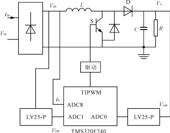 數(shù)字信號處理器(DSP)是近年來迅速崛起的新一代可編程處理器,其內(nèi)部集成了波特率發(fā)生器和FIFO緩沖器,提供高速同步串口和標準異步串口,有的片內(nèi)還集成了采樣/保持和A/D轉(zhuǎn)換電路,并提供PWM信號輸出。與單片機相比,DSP具有更快的CPU、更高的集成度和更大容量的存儲器。DSP屬于精簡指令系統(tǒng)計算機(RISC),大多數(shù)指令都能在一個周期內(nèi)完成,并可通過并行處理技術(shù),在一個指令周期內(nèi)完成多條指令。同時,DSP采用改進的哈佛結(jié)構(gòu),具有獨立的程序和數(shù)據(jù)空間,允許同時存儲程序和數(shù)據(jù)。內(nèi)置高速的硬件乘法器,增加了多級流水線,使其具有高速的數(shù)據(jù)運算能力。而單片機為復雜指令系統(tǒng)計算機(CISC),多數(shù)指令要2~3個指令周期才能完成。單片機采用諾依曼結(jié)構(gòu),程序和數(shù)據(jù)在同一空間存儲,同一時刻只能單獨訪問指令或數(shù)據(jù)。單片機的ALU只能做加法,而乘法則需要由軟件來實現(xiàn),因而需要占用較多的指令周期,速度比較慢。與16位單片機相比,DSP執(zhí)行單指令的時間快8~10倍,一次乘法運算時間快16~30倍[3]。 在電力電子裝置中,DSP主要完成主電路控制、系統(tǒng)實時監(jiān)控及保護、系統(tǒng)通信等功能。應(yīng)用的具體電路包括UPS逆變控制電路、交流電機調(diào)速電路、功率因數(shù)校正電路和諧波抑制電路等。文獻[4]研制了一種1~2kVA小型單相在線式UPS,采用以TMS320F240(包含專用PWM產(chǎn)生電路、兩路10位A/D采樣通道、28個復用I/O口)為核心的數(shù)字化控制電路,完成系統(tǒng)級控制和逆變器(開關(guān)頻率為20kHz)控制。仿真和實驗表明,電路輸出穩(wěn)定、動靜態(tài)特性良好。DSP在系統(tǒng)中還承擔數(shù)字鎖相、檢測、顯示控制以及與上位機的通信功能。文獻[5]介紹了利用TMS320F240型DSP控制電機運行的實現(xiàn)方法。F240具有20MIPS的高速處理能力和面向電機控制的專用外圍設(shè)備,能實時產(chǎn)生空間向量對稱PWM波形,實現(xiàn)包括電流環(huán)在內(nèi)的全數(shù)字調(diào)制。文獻[6]介紹了采用由DSP和微處理器構(gòu)成雙PWM控制的變流器的工作原理和硬件構(gòu)成,電路具有結(jié)構(gòu)簡單、控制靈活、實時性好、功率因數(shù)高等特點,對諧波具有非常好的抑制效果。文獻[7]用DSP芯片TMS320F240實現(xiàn)了輸出功率為2kW的單相PFC電路的數(shù)字控制。圖2為控制系統(tǒng)原理圖,開關(guān)頻率為33kHz。實驗測得功率因數(shù)0.994,效率95%。 雖然DSP有著許多優(yōu)點,但是它也存在一些局限性,如采樣頻率的選擇、PWM信號頻率及其精度、采樣延時、運算時間及精度等。這些因素會或多或少地影響電路的控制性能。