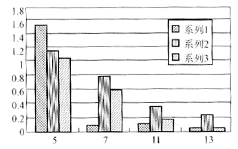 圖14? 在8kW,800V直流輸出時(shí)IEC-61000-3-2A類標(biāo)準(zhǔn)與固定開關(guān)頻率及諧波注入法5,7,11,13次諧波幅值的比較(圖中系列1,2,2分別為m=4%時(shí)固定開關(guān)頻率,IEC標(biāo)準(zhǔn),六次諧波注入)