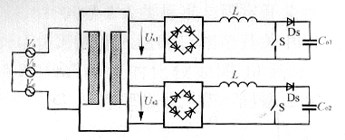 圖4? 由三個(gè)單相PFC組成三相PFC電路2 ??? 圖5是通過工頻變壓器把三相電壓變換成2個(gè)單相,這兩相的輸出電壓幅值相同,相位差90°。然后用2個(gè)單相PFC電路來實(shí)現(xiàn)三相PFC的功能[4]。與圖3及圖4相比,這種電路少用一個(gè)單相PFC模塊。變壓器可以實(shí)現(xiàn)PFC電路與輸入網(wǎng)側(cè)間的隔離作用。而且通過變壓器變比的設(shè)計(jì),可以調(diào)整PFC的輸入電壓。但使用變壓器增大了系統(tǒng)的體積和重量。