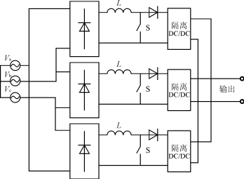 圖2? 三相六開關(guān)PFC電路控制圖 3? 單相PFC組合的三相PFC ??? 由三個(gè)單相的PFC電路組合構(gòu)成三相PFC電路如圖3及圖4所示[1,2,3]。圖3中每個(gè)單相PFC后跟隨一個(gè)隔離型DC/DC變換器。DC/DC變換器的輸出并聯(lián)后向負(fù)載供電,該電路由于需3個(gè)外加隔離DC/DC變換器,因此成本較高。圖4電路是3個(gè)單相PFC變換器在輸出端直接并聯(lián)而成的。每個(gè)單相PFC的控制可采用平均電流控制法、峰值電流控制法或固定導(dǎo)通時(shí)間控制法。單相PFC組合成三相PFC的技術(shù)優(yōu)勢(shì)是:可以利用比較成熟的單相PFC技術(shù),而且電路由3個(gè)單相PFC同時(shí)供電,如果某一相出現(xiàn)故障,其余兩相仍能繼續(xù)向負(fù)載供電,電路具有冗余特性。與三相六開關(guān)PFC相比,開關(guān)器件少,沒有直通問題,控制可沿用單相PFC成熟的控制技術(shù)。但是這種電路由3個(gè)單相PFC組成,使用的元器件比較多。圖4電路中3個(gè)單相PFC之間存在相互影響,即使加入隔離電感和隔離二極管后也不能完全消除這種影響。電路的效率和輸入電流THD指標(biāo)有所下降,不適合于大功率應(yīng)用。