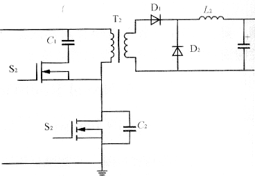 圖3? PFC電路原理 3.3? 主變換電路 ??? DC/DC變換,常用的拓撲結(jié)構(gòu)有全橋結(jié)構(gòu),雙正激結(jié)構(gòu)。全橋結(jié)構(gòu)輸出功率大,變壓器利用率高,但存在著變壓器偏磁以及功率管直通的隱患。雙正激結(jié)構(gòu)由于不存在直通問題,具有較高的可靠性而倍受關(guān)注,是一種大力推崇的電路結(jié)構(gòu),但存在變壓器利用率低的問題。 ??? 為提高效率,新型整流器中使用了單端有源箝位,零電壓開關(guān)技術(shù)。單端有源箝位電路中利用有源器件對常規(guī)的單端正激變壓器進行復(fù)位,使變壓器工作于一、三象限,提高了變壓器利用率。同時由于是單端線路,避免了開關(guān)器件的直通問題,保證了整機的高可靠性。開關(guān)管工作于零電壓狀態(tài)開關(guān)大大降低了開關(guān)器件的開關(guān)損耗,同時也降低了電磁干擾。主變換電路如圖4所示。