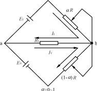 圖3電橋式比較電路的等值電路 速度快,輸出電壓的交流分量小,傳輸特性的線性度好,且與負(fù)載大小無關(guān)。該比較電路的等值電路示于圖3。從等值電路上可以看出,它與傳統(tǒng)電路不同之點(diǎn)是:比例于弧流信號的II同比例于弧壓信號的IV值在電橋的對角線負(fù)載RL電路內(nèi)進(jìn)行比較,依靠改變?chǔ)林担ㄏ喈?dāng)于電位器R的旋轉(zhuǎn)角度),來改變弧流設(shè)定值。根據(jù)圖3等值電路,該環(huán)節(jié)的輸入輸出特性可由下列公式導(dǎo)出: 省去推導(dǎo),可得:uab=〔(1-α)EI-αEV〕(5) 由于本調(diào)節(jié)器中的RL?R,所以可寫: uab=uout=(1-α)EI-αEV(6) 式(6)給出了比例于弧流值的EI及比例于弧壓值的EV,同比較環(huán)節(jié)輸出電壓uout之間的關(guān)系式。當(dāng)需要改變弧流設(shè)定值時(shí),只要改變?chǔ)粒锤淖冸娢黄鱎的滑動(dòng)觸點(diǎn)),uout即發(fā)生變化,經(jīng)過調(diào)節(jié)器的調(diào)節(jié)作用,使電極位置發(fā)生變化,結(jié)果弧流得到改變,從式(6)可以清楚地看出,該環(huán)節(jié)輸出電壓uout只與弧流和弧壓的信號差成正比,而與其他參量無關(guān),從而證明了該環(huán)節(jié)理論上的正確性。電橋式比較電路還具有弧流整定范圍寬〔因?yàn)閮蓚€(gè)橋臂同時(shí)向相反方向整定,現(xiàn)場測試數(shù)據(jù)竟達(dá)到(15~150)%Ie值,標(biāo)準(zhǔn)規(guī)定為(30~125)%Ie?!?,輸入阻抗小的優(yōu)點(diǎn)。后者特性非常寶貴,它可使前級電流互感器負(fù)載阻抗減小,經(jīng)測試,它將前級大電流互感器TA1的負(fù)載阻抗降為原來的1/3,即小于0.8Ω,這就使弧流控制和顯示準(zhǔn)確度顯著提高,這也是調(diào)節(jié)器調(diào)節(jié)精度提高的原因之一。 3變頻式電極調(diào)節(jié)器的關(guān)鍵部件——高性能變頻器 為了使異步電動(dòng)機(jī)供電頻率可變,自然需要一套變頻電源。但在過去,采用旋轉(zhuǎn)變頻機(jī)組或離子變頻器作為變頻電源,設(shè)備龐大,可靠性差。隨著大功率電力電子器件及變流技術(shù)的發(fā)展,特別是大功率IGBT的工業(yè)應(yīng)用,使變頻器上升到一個(gè)新的臺(tái)階。目前,采用IGBT作為逆變器的變頻器型號很多,我們選用日本富士電機(jī)公司生產(chǎn)的FRN5000G11S型高性能低噪聲變頻器(圖4中U1),屬VVVF型,就是說在調(diào)頻的同時(shí)還要調(diào)壓。這是由于異步電動(dòng)機(jī)的外加電壓近似地同頻率和磁通的乘積成正比,即 U1≈C1f1?(7)