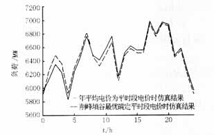 ??? 通過比較仿真結(jié)果可以看出,目標(biāo)函數(shù)3占的比例比較大時,峰谷負(fù)荷差最小,而且峰負(fù)荷與實行分時電價前比減少了821.4MW,可以在削峰和填谷之間達(dá)到最佳均衡。因此,本文對目標(biāo)函數(shù)1、3的權(quán)值取為0.2、0.8。