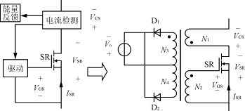 圖3傳統(tǒng)的電流型驅(qū)動(dòng)電路 Pturnon(SW) 其中:Vin-nVo?Von?Vin+nV; Vo為輸出電壓; fs為開關(guān)頻率。 也就是說,當(dāng)原邊開關(guān)在諧振電壓的峰值開通時(shí),電路的效率最低,相反,在谷值開通時(shí),電路的效率最高。因?yàn)橹C振的時(shí)間tDCM=t5-t4會(huì)隨著輸入電壓的變化而變化,即Von會(huì)隨著輸入電壓的變化而變化,從而電路的效率會(huì)隨著輸入電壓的變化而發(fā)生擾動(dòng)。另一方面,由于SR的輸出電容CSW比一般的肖特基二極管要大,由式(1)可知,采用同步整流的電路的諧振電流要比采用肖特基二極管的電路大,這個(gè)電流流過SR,從而產(chǎn)生比較大的損耗。所以,如果電路的器件或者參數(shù)設(shè)計(jì)不當(dāng),用SR來代替二極管不一定能提高效率。 這個(gè)電路的另一種工作方式VFDCM就是基于這種思想產(chǎn)生的。t3時(shí)刻SR關(guān)斷后,在VDS第一次到達(dá)谷底時(shí)(見圖2的t4時(shí)刻)開通原邊開關(guān),就可以達(dá)到減小開關(guān)損耗的目的,可以從整體上提高電路效率。 3同步整流管的驅(qū)動(dòng) SR的驅(qū)動(dòng)是同步整流電路的一個(gè)重要問題。有的電路可以采用自驅(qū)動(dòng),典型的電路比如采用有源箝位的正激電路,這種驅(qū)動(dòng)由于是利用變壓器副邊的電壓來驅(qū)動(dòng)SR,不必另加電路,即節(jié)約了成本,又提高了電路的效率。而有的時(shí)候?yàn)榱四軌蚋`活地控制SR,則可以采用他驅(qū)動(dòng)。 如前所述,只要采用零電流檢測(cè)技術(shù),反激電路也是可以采用自驅(qū)動(dòng)。傳統(tǒng)的電流驅(qū)動(dòng)電路如圖3所示。這種驅(qū)動(dòng)電路是消耗能量的,為了減小這種損耗,電流檢測(cè)線圈的壓降必須盡可能低。實(shí)際電路中一般要達(dá)到整流管壓降的1/10。比如說,在圖3中,如果VSR=0.1V,則VCS要在0.01V左右。而SR的驅(qū)動(dòng)電壓至少要5V,這樣會(huì)導(dǎo)致N2和N1的匝數(shù)比非常大。這不僅使得電流檢測(cè)裝置非常笨重,而且會(huì)增大漏感,影響到同步管的迅速開通。這也是這種電路不適合在高頻下工作的原因。 為了解決電流檢測(cè)電路所引起的損耗問題,提出了具有能量反饋(energyrecovery)的電流檢測(cè)電路[2],如圖4所示。