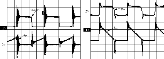 (c)Vin=60V時(shí)VDS(SW)與ipri波形?????? (d)Vin=60V時(shí)VSR與isec波形 圖5實(shí)驗(yàn)波形