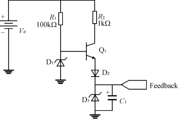 圖3? 啟動(dòng)電路圖 ??? 該啟動(dòng)電路由雙極性晶體管Q1,穩(wěn)壓二極管D1,D3和二極管D2以及電容C1構(gòu)成。在電路啟動(dòng)的初期,輸入的直流電源通過(guò)雙極性晶體管Q1給電容C1充電,使電路開(kāi)始工作。等到反饋的電壓值Feedback比電路中的穩(wěn)壓二極管D1的穩(wěn)壓值大時(shí),雙極性晶體管Q1被關(guān)斷,該電路停止工作。PWM比較器的工作電壓由Feedback信號(hào)提供。這種電路的優(yōu)點(diǎn)是可以有效地減小損耗,而很多國(guó)外產(chǎn)品的啟動(dòng)電路是由大電阻和電容構(gòu)成,因而在電阻上將會(huì)有一定的損耗。 ??? 在圖1的驅(qū)動(dòng)控制電路中,我們還可以看到,該電路有逐周電流檢測(cè)功能。逐周的峰值漏極電流限制電路以原邊電流的采樣電阻作為檢測(cè)電阻。器件內(nèi)部的PI調(diào)節(jié)器的輸出值設(shè)有+5V的電壓限制,而采樣電阻上的電壓值放大5倍后與PI調(diào)節(jié)器的輸出值進(jìn)行比較,故設(shè)計(jì)電路時(shí)就可以精確地計(jì)算出電流峰值,通過(guò)選定采樣電阻值和原副邊的匝數(shù)比來(lái)進(jìn)行電流限制。當(dāng)MOSFET的漏極電流太大使采樣電阻上的壓降放大后超過(guò)+5V的閾值時(shí),MOSFET就會(huì)被關(guān)斷,直到下一個(gè)時(shí)鐘周期開(kāi)始。 3? 動(dòng)態(tài)性能試驗(yàn) ??? 1)負(fù)載變化時(shí)輸出電壓的動(dòng)態(tài)特性 ??? 當(dāng)負(fù)載變化時(shí),輸出電壓也在瞬間變化,然后反饋到控制引腳,器件內(nèi)部的控制電路就會(huì)做出相應(yīng)的調(diào)整,改變MOSFET器件開(kāi)關(guān)的占空比,以實(shí)現(xiàn)輸出電壓穩(wěn)定的目的。 ??? 圖4(a)是負(fù)載變小時(shí)輸出電壓波形的變化情況。負(fù)載變小,輸出電壓變大,導(dǎo)致電壓反饋的誤差放大值變小,脈寬調(diào)制器的輸出波形的占空比變小,使輸出電壓變小,最終使輸出電壓趨向于穩(wěn)定值。此時(shí),輸出電壓的反饋值為+5V。 ??? 圖4(b)是負(fù)載變大時(shí)的輸出電壓波形。同理,可以分析出輸出電壓的變化過(guò)程。