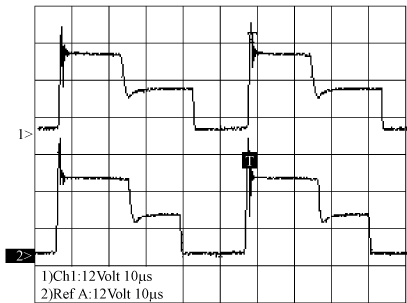 圖4? 負(fù)載變化時(shí)輸出電壓的動(dòng)態(tài)特性圖 ??? 在同一個(gè)輸入電壓不同負(fù)載情況下MOSFET器件的uDS的波形如圖5所示。
