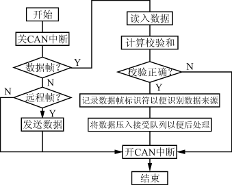 圖4? CAN總 線 系 統(tǒng) 結(jié) 構(gòu) 圖 4? CAN總線的軟件設(shè)計(jì) ??? CAN總線的三層結(jié)構(gòu)模型為:物理層、數(shù)據(jù)鏈路層和應(yīng)用層。其中物理層和數(shù)據(jù)鏈路層的功能由SJA1000完成,系統(tǒng)的開(kāi)發(fā)主要在應(yīng)用層軟件的設(shè)計(jì)上,它主要由三個(gè)子程序:初始化子程序、發(fā)送數(shù)據(jù)和接收數(shù)據(jù)程序。同時(shí),還包括一些數(shù)據(jù)溢出中斷以及幀出錯(cuò)的處理。 ??? SJA1000在上電硬件復(fù)位之后,必須對(duì)其進(jìn)行軟件初始化之后才可以進(jìn)行數(shù)據(jù)通訊,初始化過(guò)程主要包括對(duì)其復(fù)位模式下配置時(shí)鐘分頻寄存器CDR、總線定時(shí)寄存器BTR0和BTR1、驗(yàn)收代碼寄存器ACR、驗(yàn)收屏蔽寄存器AMR及輸出控制寄存器OCR等,實(shí)現(xiàn)對(duì)總線的速率、驗(yàn)收屏蔽碼、輸出引腳驅(qū)動(dòng)方式、總線模式及時(shí)鐘分頻進(jìn)行定義。具體的流程如圖5所示。下面為SJA1000發(fā)送和接收數(shù)據(jù)的流程,基本過(guò)程為主控制器將數(shù)據(jù)保存到SJA1000發(fā)送緩沖器,然后對(duì)命令寄存器的發(fā)送請(qǐng)求TR標(biāo)志位進(jìn)行置位開(kāi)始發(fā)送;接收過(guò)程為SJA1000將從總線上接收到的數(shù)據(jù)存入接收緩沖器,通過(guò)其中斷標(biāo)志位通知主控制器來(lái)處理接收到的信息,接收完畢之后清空緩沖器,等待下次接收,具體的流程如圖6和圖7所示。