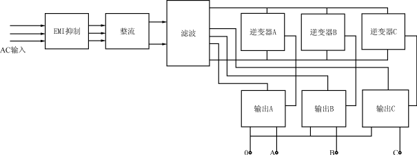 一般三相逆變電源,輸出電壓的不平衡度指標(biāo)為<2%。從表1可看出,當(dāng)負(fù)載不平衡度>20%時(shí),電壓不平衡度已經(jīng)超標(biāo)。 三相負(fù)載100%不平衡時(shí),引起逆變器的輸出有的相電壓升高,有的相電壓降低,使逆變器無法正常工作,甚至造成負(fù)載損壞。于是解決三相逆變電源,在負(fù)載100%不平衡時(shí),能正常工作刻不容緩。然而,單純要求用戶在使用過程中,保持三相負(fù)載平衡,顯然不現(xiàn)實(shí),只有在逆變電源本身尋找切實(shí)可行的解決辦法。 目前解決負(fù)載100%不平衡,采用的辦法有兩種,一是將輸出變壓器,三相繞組重新分配后再串聯(lián)起來。這種方法雖然簡(jiǎn)單,部分解決了負(fù)載不平衡,但沒有徹底解決負(fù)載100%不平衡的情況,同時(shí)電壓的穩(wěn)定度不高。二是將逆變部分,分為三個(gè)獨(dú)立的橋式逆變器,然后按相位差120°、240°的相序,組合為一個(gè)三相輸出的逆變電源。這種系統(tǒng)徹底解決了負(fù)載100%不平衡的問題,結(jié)構(gòu)關(guān)系非常明確,保證了三相輸出電壓平衡,電壓穩(wěn)定度高。但電路較復(fù)雜,器件增多,成本提高。在產(chǎn)品設(shè)計(jì)之初,必須考慮產(chǎn)品最終的各項(xiàng)技術(shù)指標(biāo)及性能,然后決定系統(tǒng)的工作模式與控制方式。綜合以上兩種方案,我們?cè)谘兄菩庐a(chǎn)品過程中,為了達(dá)到較好的輸出電壓穩(wěn)定度和平衡度,采取了第二種方案。在系統(tǒng)設(shè)計(jì)中優(yōu)化電路,減少器件,降低成本。特別是采用MITEL公司的SA4828與單片機(jī),簡(jiǎn)化控制電路取得較明顯效果。 ? 圖1系統(tǒng)原理框圖