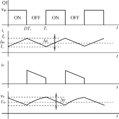 圖1升壓變換器基本電路 圖2為圖1電路的相關(guān)波形。穩(wěn)態(tài)時(shí)在一個(gè)開關(guān)周期內(nèi),電感器L儲(chǔ)存的能量與釋放的能量保持平衡,用伏秒積表示如下: ViDTs=(VO-Vi)(1-D)Ts(1) 式中Ts為開關(guān)周期,D為開關(guān)占空比。從式(1)可得: V 由于D<1, 故 VO>Vi。L兩端的電壓為: 當(dāng)開關(guān)Q1開通時(shí),根據(jù)公式(3),電感電流的變化可用式(4)計(jì)算: