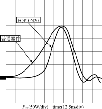 圖8柵極電壓Vgs關(guān)斷波形 耗,提高效率,主要途徑是: ?。?)選用低開關(guān)損耗的MOSFET; ?。?)選用低等效串聯(lián)電阻(ESR)的電容器C1和C5; (3)選用低等效電阻的電感線圈L1; (4)選用低導(dǎo)通電阻和低通態(tài)電壓的二極管D1。 關(guān)于L1和輸出電容C5數(shù)值選擇可根據(jù)式(7)和式(9)求出。輸出電流IO=PO/VO=70W/120V≈0.6A,開關(guān)周期Ts=1/fs=1/80kHz=12.5μs,Vi=50V,設(shè)最大占空比Dmax=0.73,代入式(7)可得: =2.5×10-3H=2.5mH 紋波電壓Δvo=120V×1%=1.2V,VO=120V,DTs=9.1μs,設(shè)負(fù)載電阻R=200Ω,代入式(9)可得: 考慮在輸出負(fù)載瞬時(shí)變化時(shí)能安全運(yùn)行,可選用500μF/200V低ESR的電容器。 選用低損耗的MOSFET是提高升壓變換器效率的關(guān)鍵一環(huán)。目前快捷公司推出的新一代MOSFET—QFET系列產(chǎn)品,則具有低損耗特征。 3?2QFET的主要特點(diǎn) QFET是新一代MOSFET。在芯片結(jié)構(gòu)上,采用了條狀P+槽(或P+阱)替代了傳統(tǒng)MOSFET有源區(qū)中的蜂窩狀P+槽,并形成柱面結(jié),從而在相同的擊穿電壓下可使用較低電阻率的外延層(N-),因而有較低的導(dǎo)通電阻Rds(on)。同時(shí),通過對(duì)柵極氧化層的控制,有較低的柵極電荷Qg。 在QFET系列產(chǎn)品中,F(xiàn)QP10N20(200V/10A)適合于在彩色顯示器電源中用作開關(guān)。FQP10N20采用TO?220封裝,Rds(on)=0.28Ω(典型值),Qg=13.5nC(典型值),與電壓和電流容量相同并采用相同封裝的普通MOSFET比較,Rds(on)減少近20%,Qg約減小40%。圖4和圖5分別為FQP10N20與普通MOSFET的Rds(on)和Qg比較曲線。 3?3采用QFET替代普通MOSFET的效果 在圖3所示的升壓變換器中,當(dāng)工作條件相同時(shí),采用FQP10N20與普通器件其開關(guān)關(guān)斷波形比較如圖6所示。從圖6可知,QFET的Vds電壓上升時(shí)間和Id電流下降時(shí)間要比電壓與電流容量相當(dāng)?shù)钠胀∕OSFET都快。 圖7為FQP10N20與普通MOSFET關(guān)斷損耗波形比較。波形面積與器件關(guān)斷期間的能耗成正比,由于QFET的波形面積小于普通MOSFET,故有較低的關(guān)斷損耗。圖8示出了關(guān)斷期間柵-源極之間電壓Vgs的波形對(duì)比。由于QFET有較小的柵極電荷,所以Vgs的關(guān)斷下降時(shí)間比普通MOSFET短。 圖9為在不同工作頻率下對(duì)升壓變換器測(cè)試所獲得的數(shù)據(jù)繪制的效率曲線。由圖9可知,采用FQP10N20(QFET)替代普通MOSFET,效率有(2~4)%的提高。并且隨頻率增加,QFET對(duì)效率的改進(jìn)更加明顯。