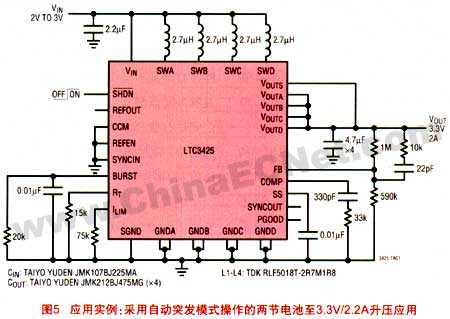 圖5給出了一款采用ltc3425來實現(xiàn)從兩節(jié)鎳鎘電池或鎳氫電池至3.3v升壓的典型應用電路。該設(shè)計能夠在每相1mhz的開關(guān)頻率條件下以高達94%的效率來提供2a以上的負載電流(4mhz輸出紋波頻率)。最大組件高度僅2.05mm,并在一個非常寬的負載范圍內(nèi)保持了高效率。