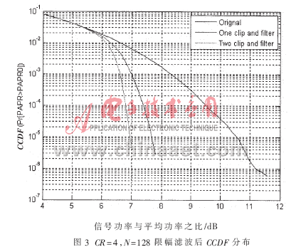 本文中采用限幅濾波技術(shù)并進(jìn)行了算法優(yōu)化。該方法不僅能降低系統(tǒng)的PAPR,而且可以有效地消除帶外噪聲,并將帶內(nèi)失真控制在一個(gè)可以接受的范圍內(nèi)。此外,結(jié)合實(shí)際系統(tǒng)設(shè)計(jì)要求,此方法減低算法的復(fù)雜度并詳細(xì)介紹了其應(yīng)用方法及仿真結(jié)果。