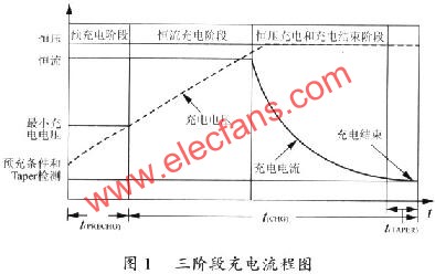 ??? 鋰系列(鋰離子或鋰聚合物)電池的充電過程分為3個(gè)階段,如圖1所示。
