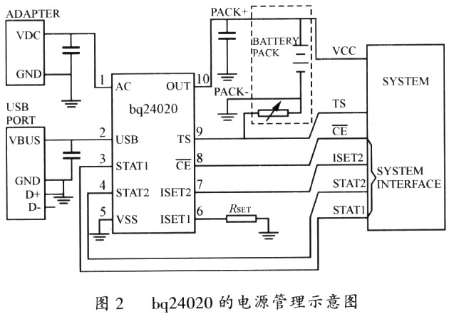 ??? 該方案的示意電路如圖2所示,該原理圖以bq24020芯片為核心,配以必要的外圍元器件。由于bq24020芯片的高集成化,使得所需的外圍元器件大大減小,只需要3顆濾波電容和1顆用于設(shè)置AC預(yù)充率的電阻即可。