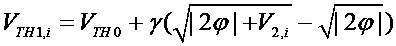 其次,考慮體效應(yīng)的影響器件的閾值電壓在不斷變化。因V2和V3不斷升高,即N1、N2管源極電位不斷升高,考慮襯底偏置效應(yīng)后器件的閾值電壓由下式給出: