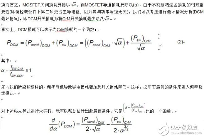 重負(fù)載、低線路電壓條件下,就出現(xiàn)這種情況?! ?當(dāng)導(dǎo)電損耗略小于開(kāi)關(guān)損耗時(shí),就需要有限程度地降低頻率。但程度必須有限。否則,就完全泯滅了在開(kāi)關(guān)損耗方面的好處,或者是無(wú)法針對(duì)導(dǎo)電損耗增加(綠色及紫色跡線