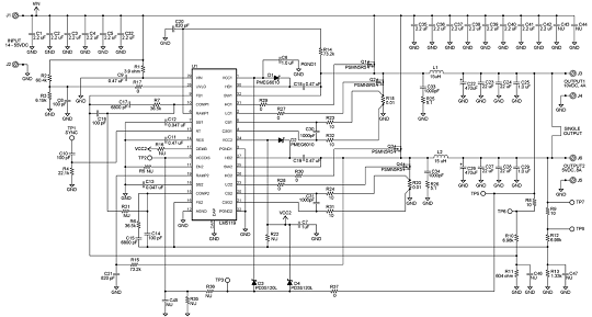 用于測試。圖2:雙路輸出DC-DC轉(zhuǎn)換器的效率曲線。圖3說明了單輸出雙相降壓轉(zhuǎn)換器。它具有LTC3892-2,該控制器采用32引線QFN封裝,并提供與LTC3892類似的功能。但是,有兩個(gè)保護(hù)電路被禁