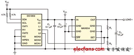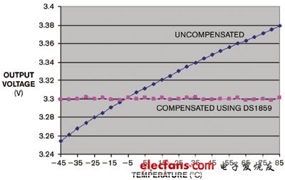 本文對比了標準配置下穩(wěn)壓器與DS1859雙通道溫控電阻配對的相同穩(wěn)壓器的結(jié)果。DS1859通過可變電阻和溫控查找表(LUT)進行溫度補償。因此,DS1859清楚地說明了溫度索引LUT如何改善關(guān)鍵系統(tǒng)
