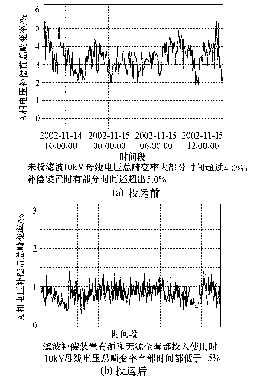 圖4?補(bǔ)償裝置投運(yùn)前后10kV側(cè)母線電壓的諧波總畸變率變化