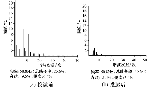 圖3?補(bǔ)償裝置投運(yùn)前后10kV側(cè)線路電流的頻譜分析