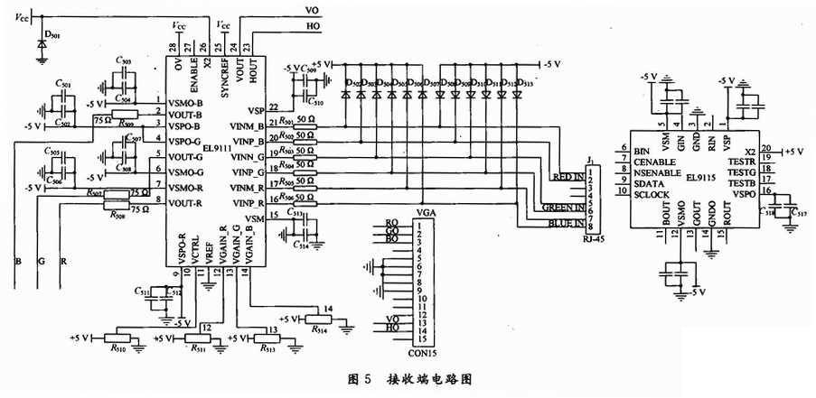 復(fù)合視頻通常是單端非平衡視頻信號(hào),VGA雙絞線(xiàn)視頻發(fā)送器的作用是將RGBHV非平衡信號(hào)經(jīng)廣播級(jí)直流視頻緩沖(供本地VGA顯示輸出)至350MHz雙絞線(xiàn)視頻編碼器,經(jīng)調(diào)制、編碼、加重、增益轉(zhuǎn)換后成三對(duì)差分