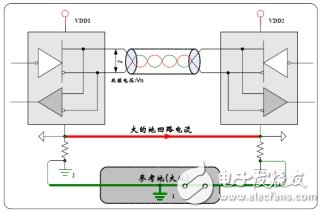 ,圖 1、圖 2分別給出了差模和共模干擾及其傳輸路徑。圖中的驅(qū)動(dòng)器及接收器為差分信號(hào)傳輸,類似CAN總線。差模干擾產(chǎn)生于兩條傳輸線之間,共模干擾則在兩條線中同時(shí)產(chǎn)生,其電勢(shì)是以地為參考。圖 1差模干擾