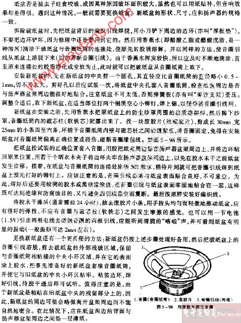 由于紙盆受潮并作劇烈震動,使得紙盤局部產(chǎn)生裂縫,放音時就會有細小的破碎聲。如果裂縫斷而細,可