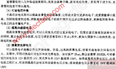 當(dāng)電視機使用了幾年時間后,顯像管會逐漸老化,最直觀的表現(xiàn)是電視機開機后,產(chǎn)生光柵的時間比原來長了,且亮度變得比原來暗,對比度也變小了。對彩色顯像管來說,