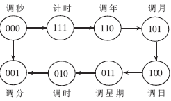 時鐘計時和時鐘調(diào)整模式通過外部按鍵K1來實現(xiàn)切換,其工作模式如圖6所示的由八種狀態(tài)變量組成。在時鐘調(diào)整模式(即除去111計時狀態(tài))的任意情況下通過按鍵K2進行時間調(diào)整。