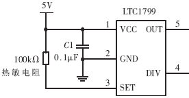 由于熱敏電阻的阻值隨溫度的變化而改變,這樣便可以通過LTC1799建立溫度和頻率之間的關(guān)系,以實現(xiàn)對溫度的測量。