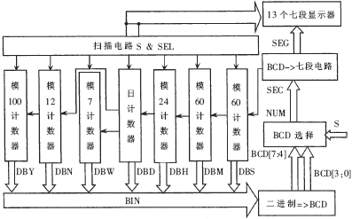 (6) 由于除了星期外,其余數(shù)據(jù)都是由2位十進制數(shù)來表示,所以先將以二進制表示的BIN碼改成兩個位數(shù)的BCD碼,然后經(jīng)過七段譯碼電路送至七段顯示器顯示。
