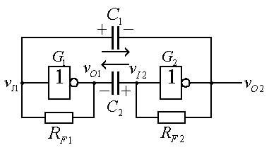 是兩個(gè)反饋電阻。只要恰當(dāng)?shù)剡x取反饋電阻的阻值,就可以使反相器的靜態(tài)工作點(diǎn)位于電壓傳輸特性的轉(zhuǎn)折區(qū)。上電時(shí),電容器兩端的電壓
