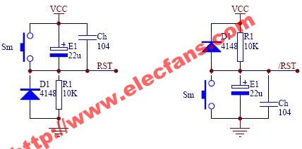 下面幾種延時(shí)復(fù)位電路,都是利用在單片機(jī)RST引腳上外接一個(gè)RC支路的充電時(shí)間而形成的。