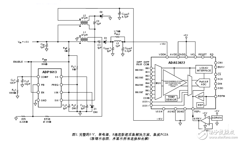 5 、單電源、8通道數(shù)據(jù)采集解決方案,集成PGIA(原理示意圖:未顯示所有連接和去耦)?+5 V單電源為電路供電,高效率、低紋波升壓轉(zhuǎn)換器產(chǎn)生±15 V電壓,可處理最高±24.576 V的差分輸入信號(hào)(±2